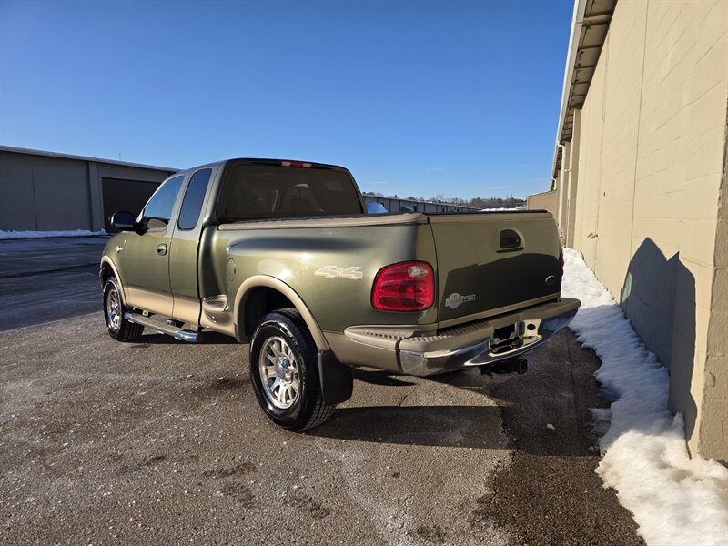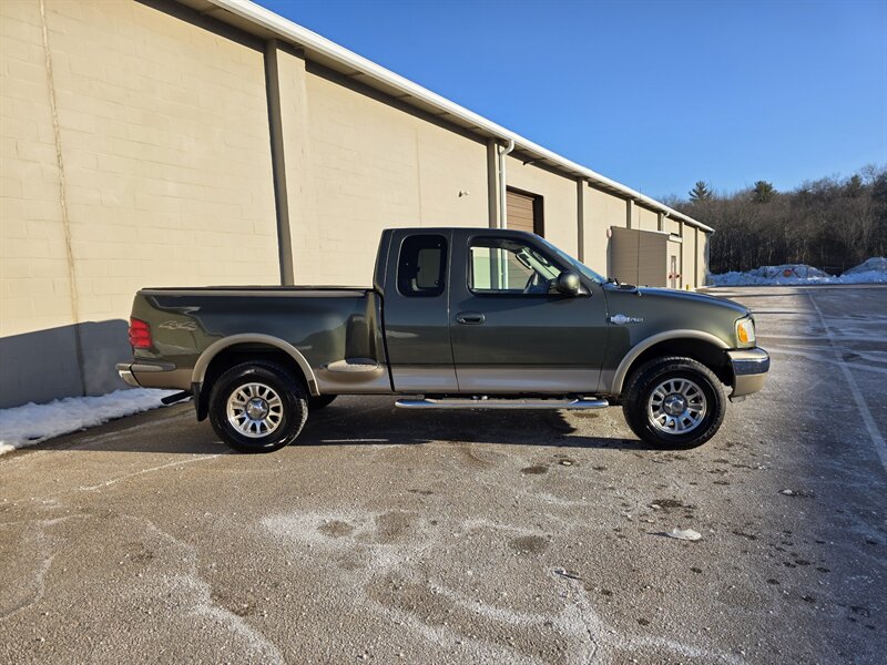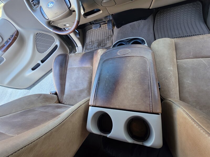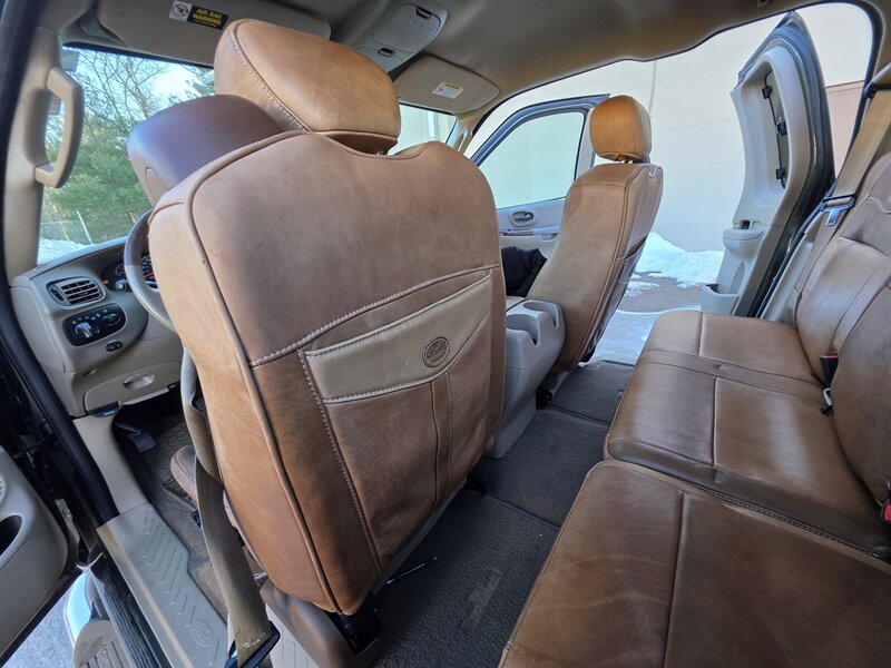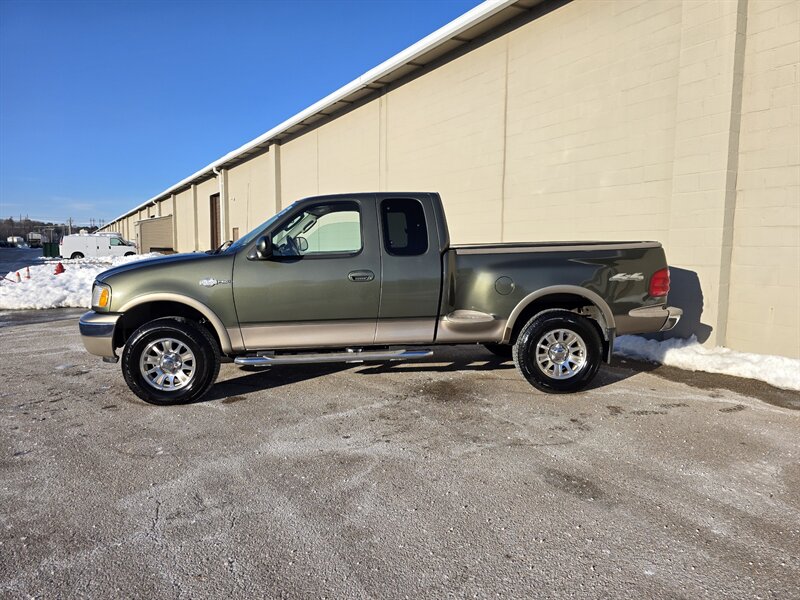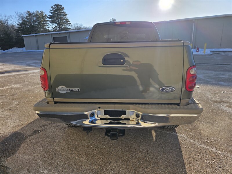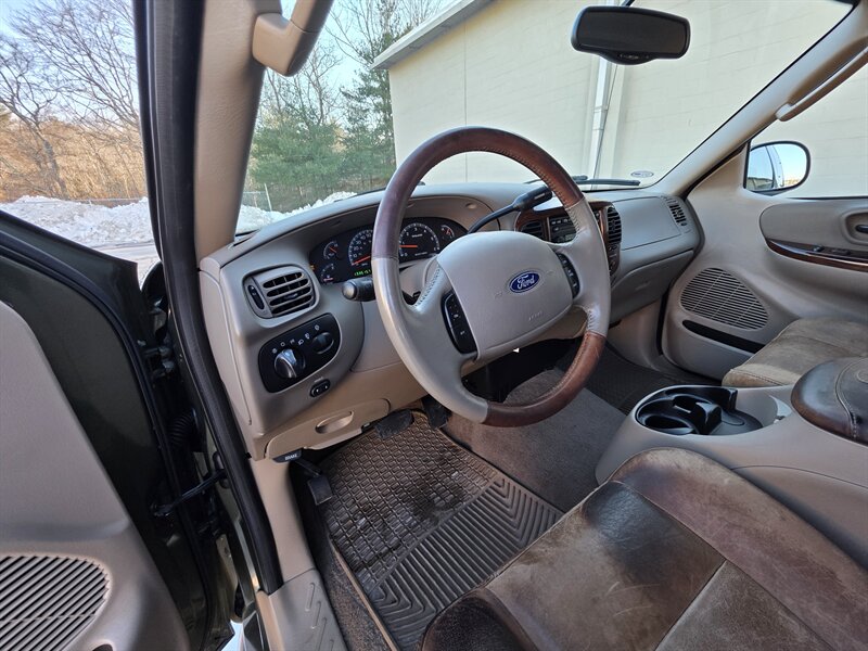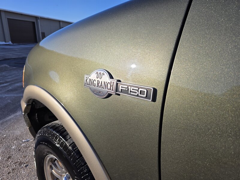 2003 Ford F-150 King Ranch powered by the Triton 5.4L V8 (260 hp / 350 lb-ft) with the factory 5.4L V8 SOHC 16V FI engine. The King Ranch trim features premium ranch-leather seating with King Ranch badging and wood-grain interior trim, power-adjustable front seats, power windows, locks and mirrors, remote keyless entry, cruise control and tilt steering, automatic climate control and an AM/FM CD stereo. Exterior and safety equipment include chrome accents and alloy wheels, plus standard dual front airbags and four-wheel anti-lock brakes. Excellent overall condition with under 134,000 miles (averaging less than 6,000 miles per year).