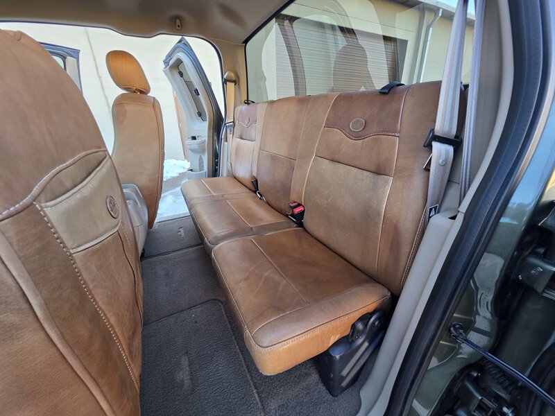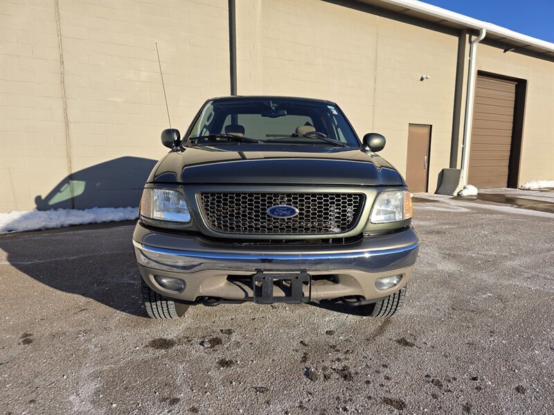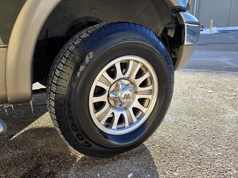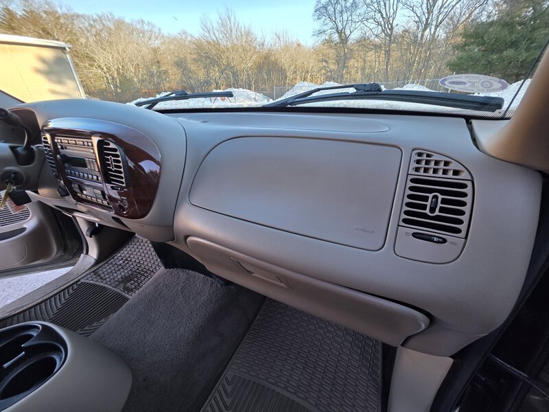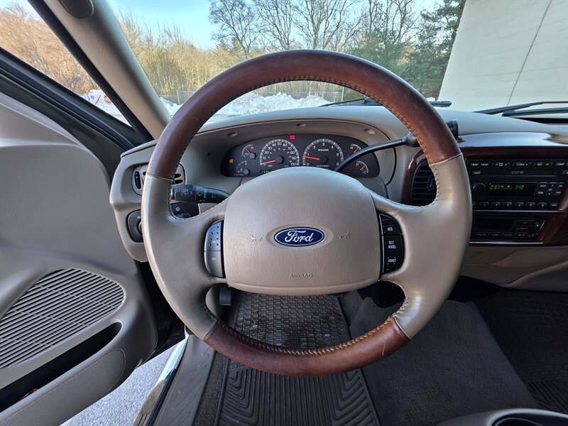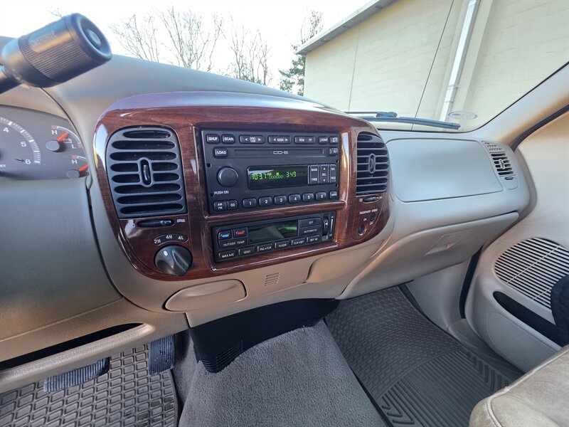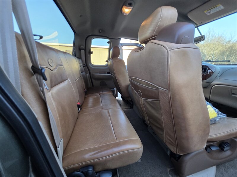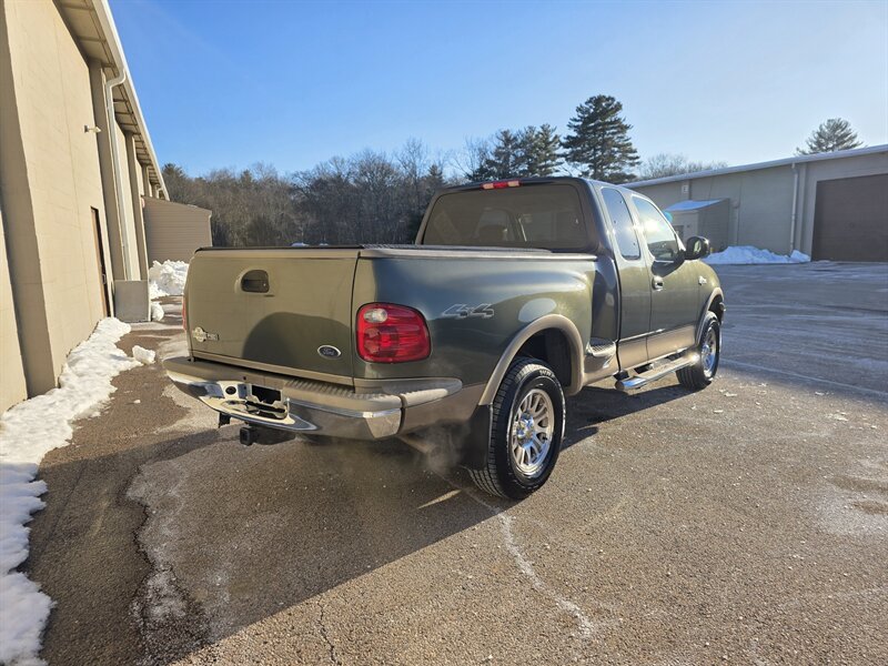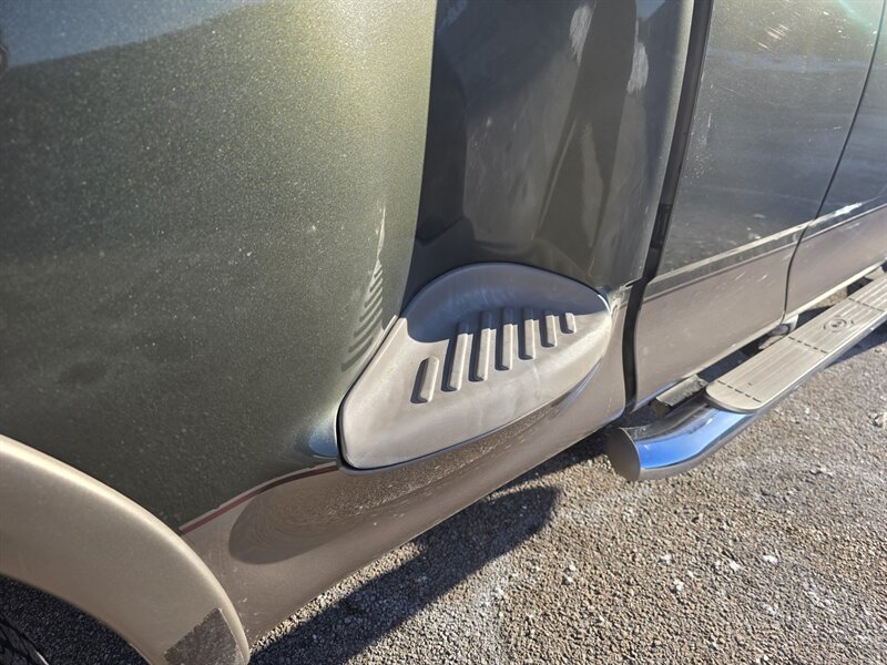 2003 Ford F-150 King Ranch powered by the Triton 5.4L V8 (260 hp / 350 lb-ft) with the factory 5.4L V8 SOHC 16V FI engine. The King Ranch trim features premium ranch-leather seating with King Ranch badging and wood-grain interior trim, power-adjustable front seats, power windows, locks and mirrors, remote keyless entry, cruise control and tilt steering, automatic climate control and an AM/FM CD stereo. Exterior and safety equipment include chrome accents and alloy wheels, plus standard dual front airbags and four-wheel anti-lock brakes. Excellent overall condition with under 134,000 miles (averaging less than 6,000 miles per year).