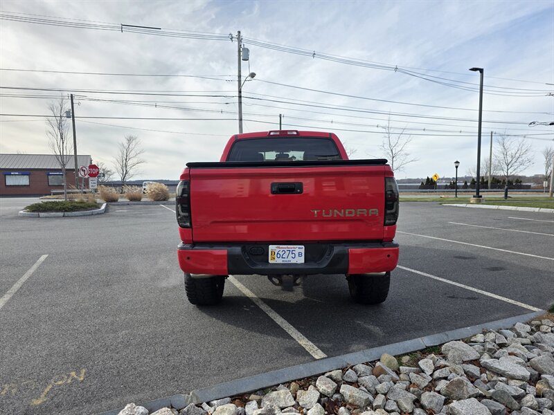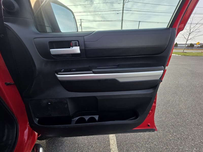 Introducing the 2015 Toyota Tundra Limited, a robust pickup truck that combines power, luxury, and capability. Under the hood, it boasts a formidable 5.7L V8 engine, delivering 381 horsepower and 401 ft-lbs of torque, ensuring exceptional performance both on and off the road. This Tundra is equipped with the Entune Premium JBL Audio system, featuring navigation for seamless travel, while the TRD Off-Road Package enhances its ruggedness, making it ideal for adventurous excursions. Factory default features include a sophisticated black leather interior, providing a comfortable and upscale driving experience. The spacious cabin is designed with modern conveniences such as a touchscreen display, Bluetooth connectivity, and a rearview camera, ensuring safety and connectivity on every journey. The exterior is finished in a striking Radiant Red, complemented by chrome accents that enhance its bold presence. Optional features include a TRD Performance Cat-Back Exhaust for improved performance and a Power Tilt/Slide Moonroof, adding an extra touch of luxury. Experience the perfect blend of strength and sophistication with the 2015 Toyota Tundra Limited.