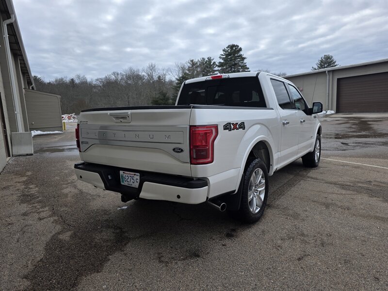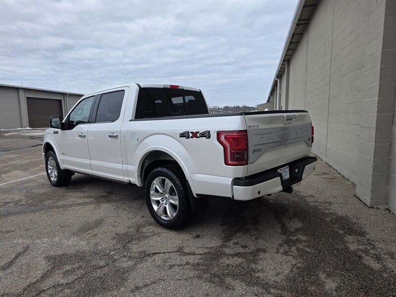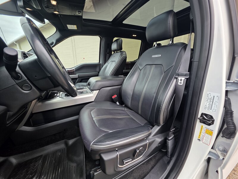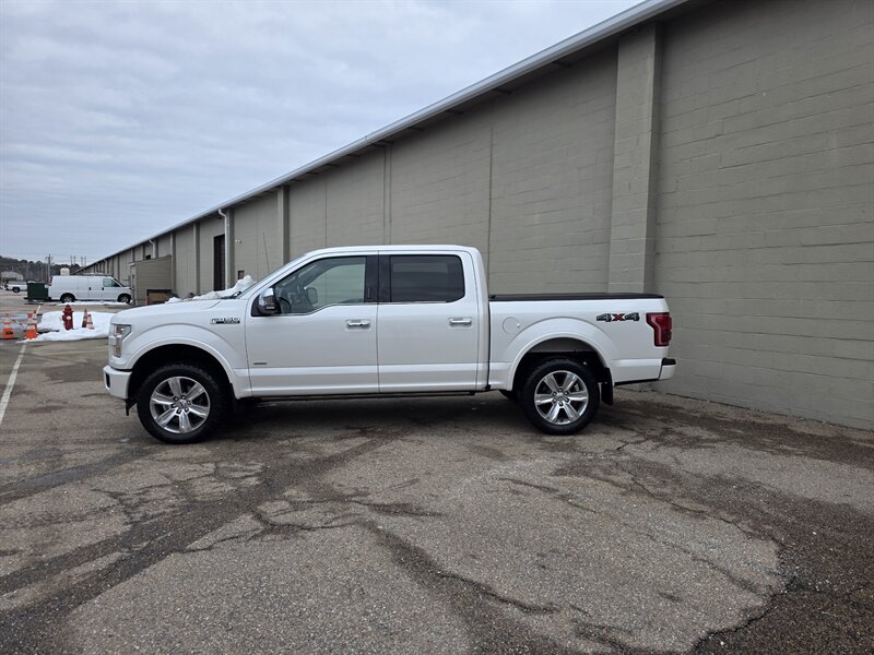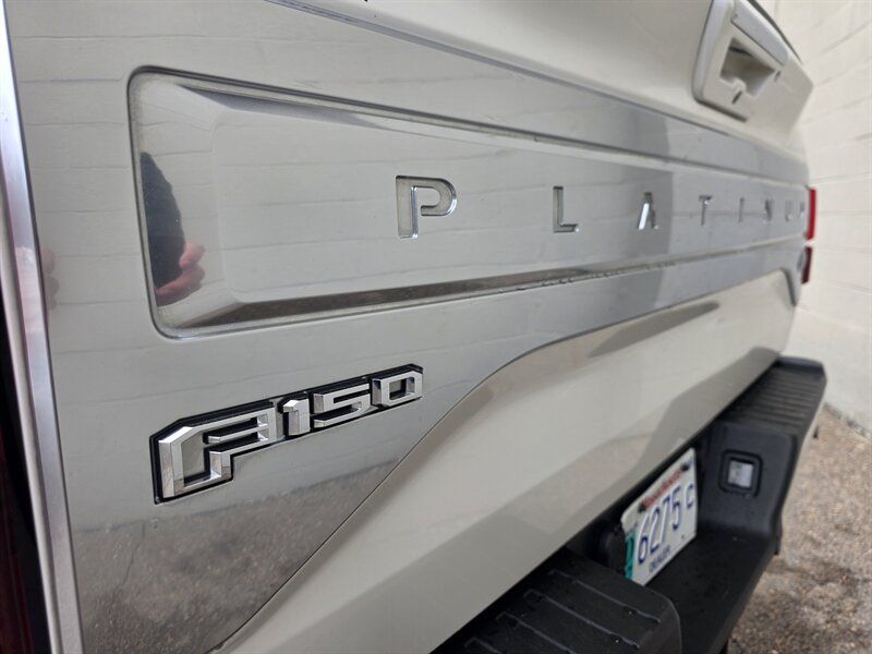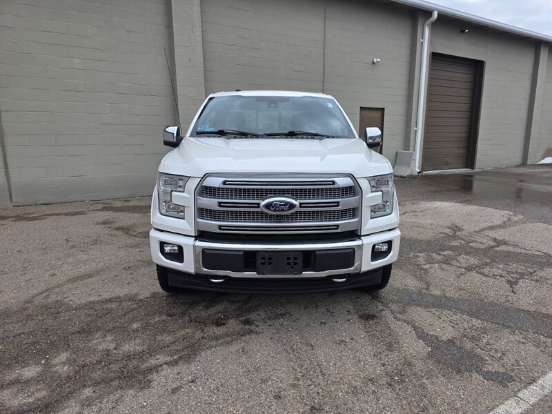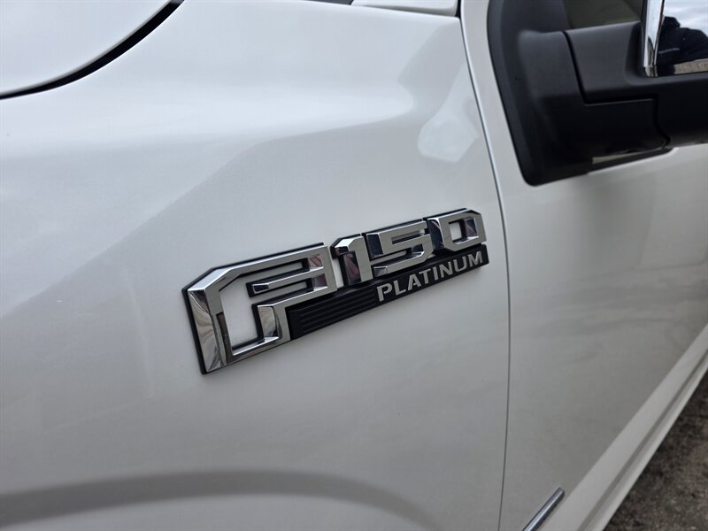 2017 Ford F-150 Platinum — White Platinum Metallic Tri-Coat exterior, Black leather interior. Powered by the 3.5L EcoBoost Twin-Turbo V6 (375 hp, 470 lb-ft). Equipment Group 701A plus optional Hard Tonneau pickup box cover, Tri-Coat paint, Auto Start-Stop and moonroof. Vehicle is in excellent overall condition. Factory-standard Platinum features (high level): - Premium leather-trimmed interior with heated and ventilated front seats, power-adjustable front seats with driver memory, and premium trim accents. - Leather-wrapped steering wheel, dual-zone automatic climate control and an upscale center stack with touchscreen infotainment (phone integration, Bluetooth) and a premium audio system. - Comprehensive safety and driver aids including multiple airbags, ABS, traction and stability control, rearview camera, trailer sway control and advanced parking aids/BLIS-type functionality. - Exterior Platinum appointments: chrome accents, premium alloy wheels, LED lighting elements and convenient power features (power mirrors, power windows/locks, available power running boards). - Practical truck features: a durable pickup bed with tie-downs, integrated towing capability and factory-installed convenience items designed for daily use and hauling. Contact us for a full equipment and options list or to schedule a viewing.