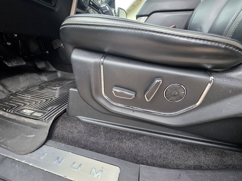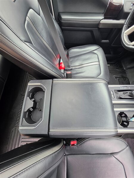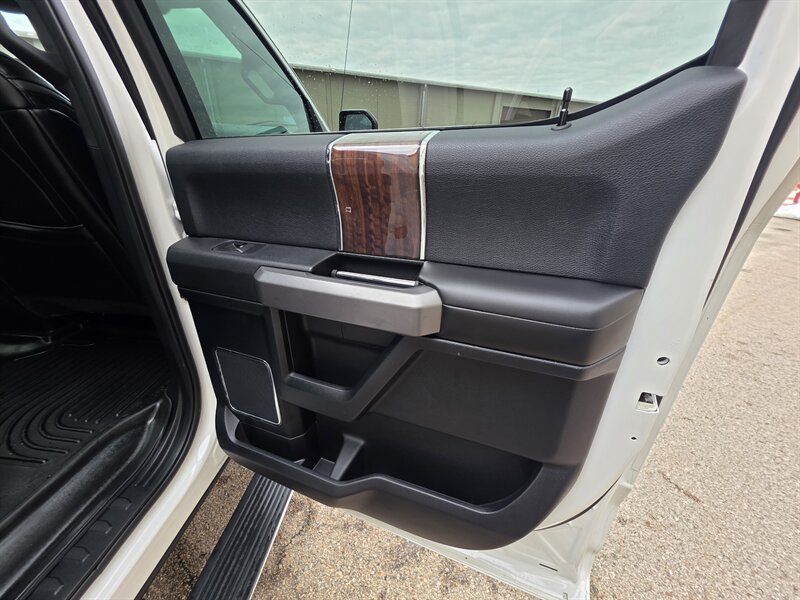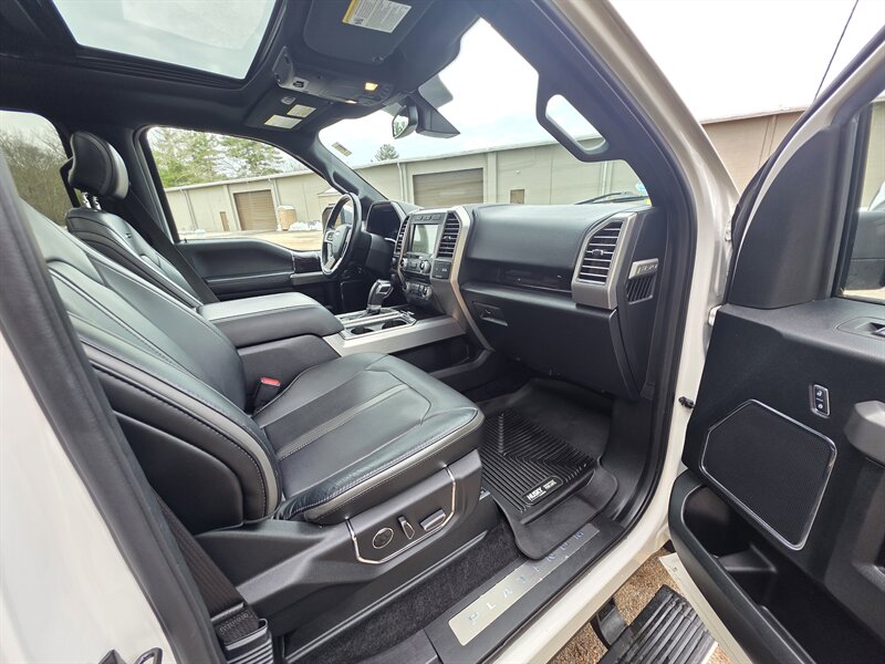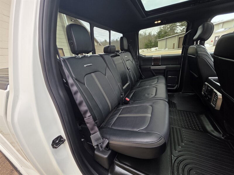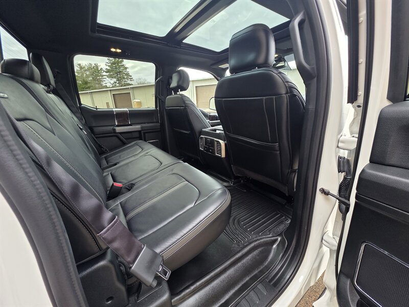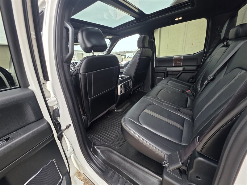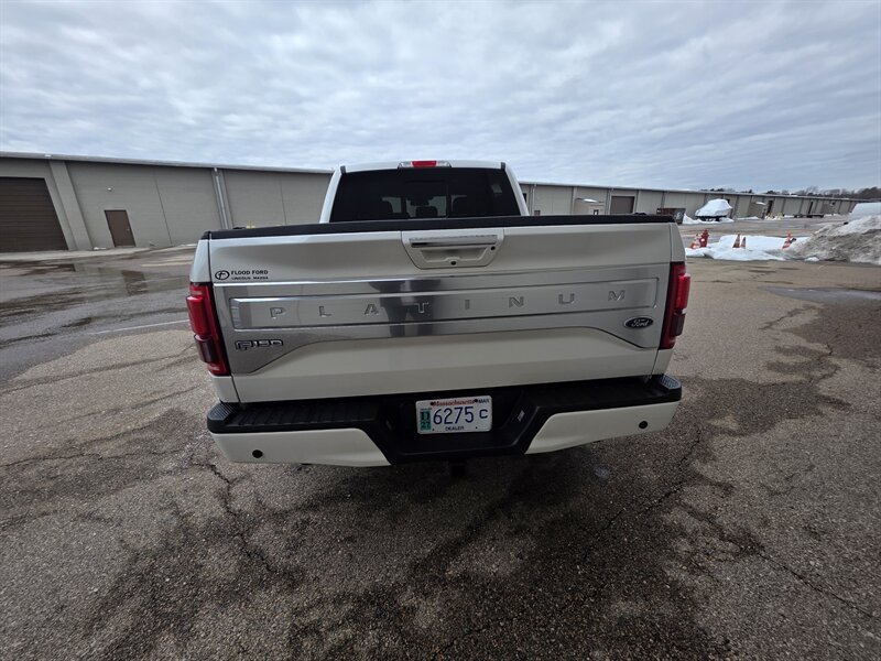 2017 Ford F-150 Platinum — White Platinum Metallic Tri-Coat exterior, Black leather interior. Powered by the 3.5L EcoBoost Twin-Turbo V6 (375 hp, 470 lb-ft). Equipment Group 701A plus optional Hard Tonneau pickup box cover, Tri-Coat paint, Auto Start-Stop and moonroof. Vehicle is in excellent overall condition. Factory-standard Platinum features (high level): - Premium leather-trimmed interior with heated and ventilated front seats, power-adjustable front seats with driver memory, and premium trim accents. - Leather-wrapped steering wheel, dual-zone automatic climate control and an upscale center stack with touchscreen infotainment (phone integration, Bluetooth) and a premium audio system. - Comprehensive safety and driver aids including multiple airbags, ABS, traction and stability control, rearview camera, trailer sway control and advanced parking aids/BLIS-type functionality. - Exterior Platinum appointments: chrome accents, premium alloy wheels, LED lighting elements and convenient power features (power mirrors, power windows/locks, available power running boards). - Practical truck features: a durable pickup bed with tie-downs, integrated towing capability and factory-installed convenience items designed for daily use and hauling. Contact us for a full equipment and options list or to schedule a viewing.